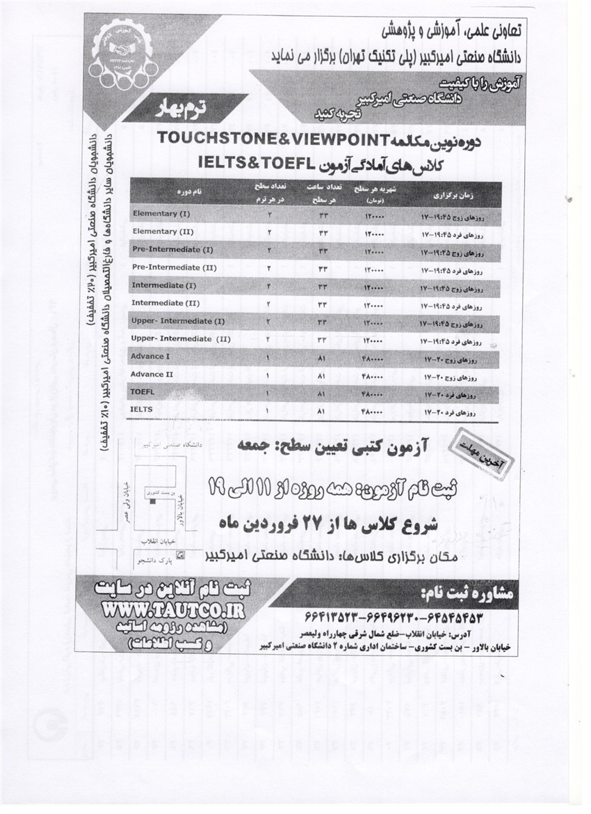 دانشجویان عزیزیکه عضوسامانه استعدادهای درخشان دانشگاه میباشید،طبق هماهنگی های بعمل آمده باتعاونی علمی ،آموزشی و پژوهشی دانشگاه صنعتی امیرکبیر (پلی تکنیک تهران )بعنوان مجری دوره های نوین مکالمه و کلاس های آمادگی آزمونIELTS-TOEFL  و دیگر دوره های آموزشی زبان انگلیسی چنانچه شما دانشجویان عزیز تمایل به ثبت نام واستفاده از این دوره ها را از فصل تابستان دارید،دراسرع وقت به سایت WWW.TAUTCO.IR (بخش ثبت نام اینترنتی-  قسمت تعیین سطح )مراجعه نمایید.توجه فرمایید ثبت نام برای تعیین سطح از تاریخ از اول خرداد ماه 1396 الی 23تیر ماه سال جاری می باشد. ضمنا"جهت هر گونه سوال ورفع ابهامات می توانید با واحد استعداد های درخشان دانشگاه تماس حاصل فرمائید.لازم بذکر است که (چهل درصد ) ازکل هزینه شما بابت شهریه پرداختی توسط مرکزمطالعات وتوسعه آموزش پزشکی (از اعتبارات واحد استعداد درخشان ) تامین خواهد شد.