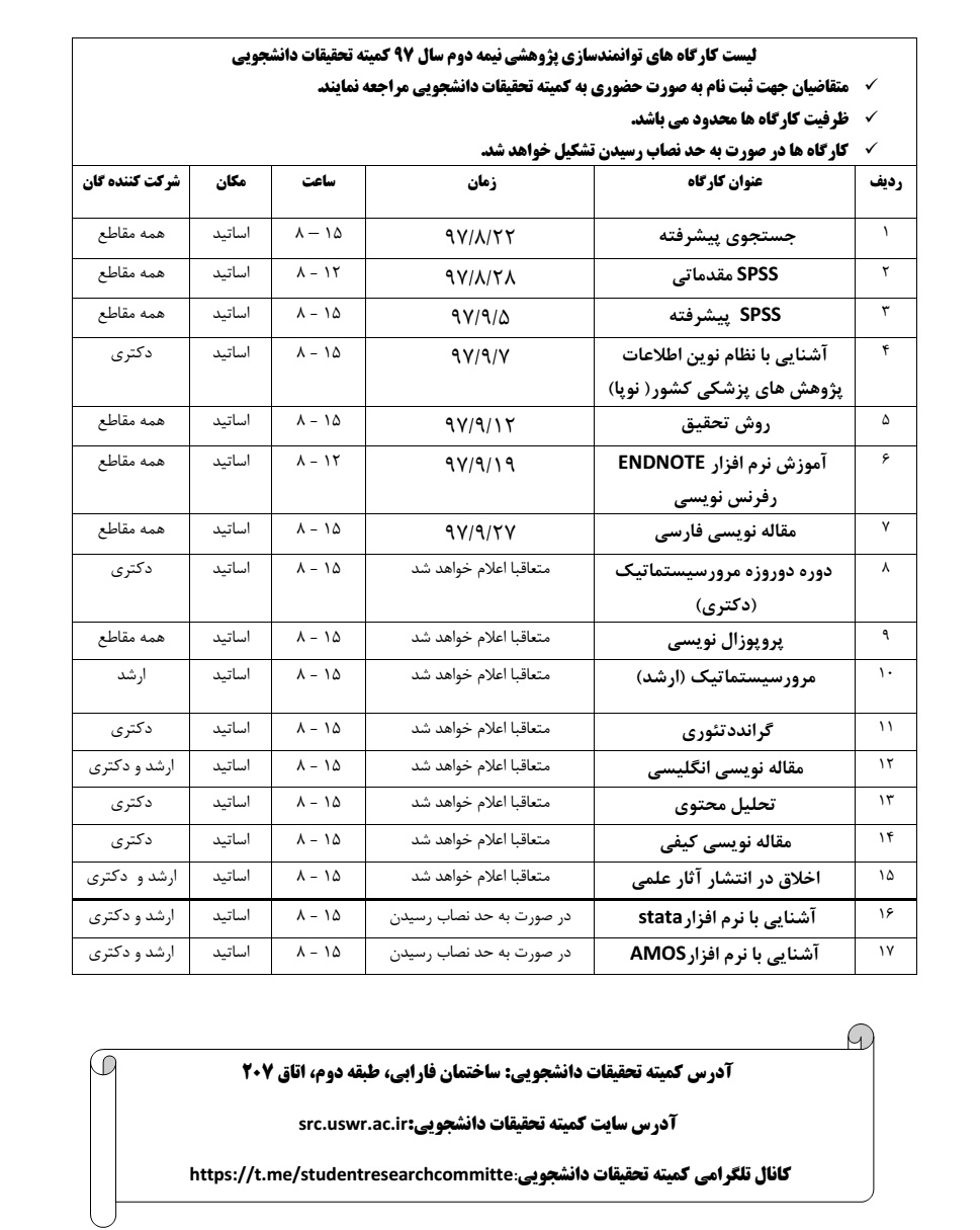 لیست کارگاه های توانمند سازی پژوهشی در نیمه دوم سال 97 کمیته تحقیقات دانشجویی
