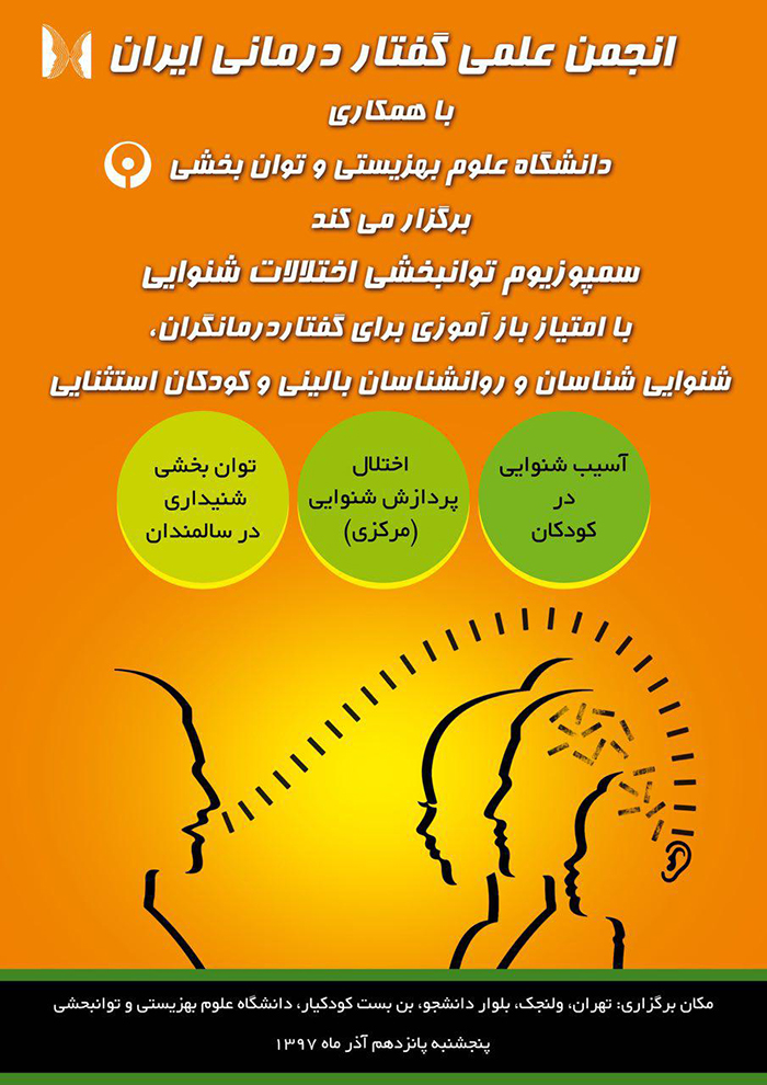به گزارش وبدای دانشگاه علوم بهزیستی و توانبخشی ، سمپوزیوم توانبخشی اختلالات شنوایی ، توسط انجمن علمی گفتاردرمانی ایران و با همکاری دانشگاه علوم بهزیستی و توانبخشی برگزار می شود و برای دانش آموختگان رشته های مختلف از جمله گفتاردرمانی، شنوایی شناسی، کاردرمانی و روانشناسی کودکان استثنایی امتیاز بازآموزی دارد.