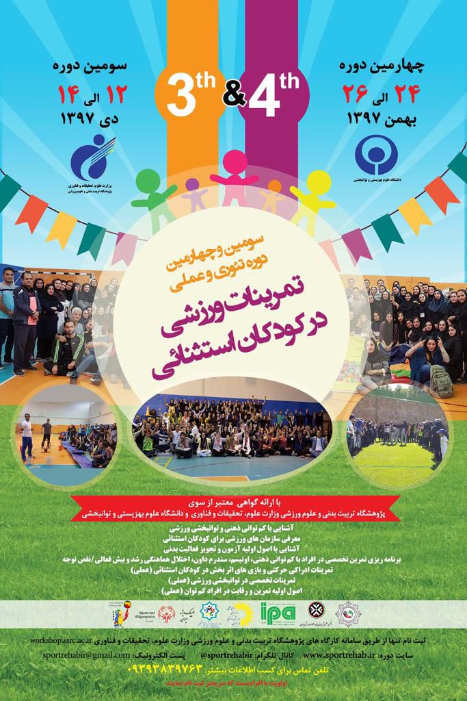 درباره دوره: پژوهشگاه تربیت بدنی و علوم ورزشی با همکاری دانشگاه علوم بهزیستی و توانبخشی سومین و چهارمین دوره تمرینات ورزشی در کودکان استثنائی را در تاریخ 12 الی 14دی (سومین دوره) و 24 الی 26 بهمن ماه سال جاری (چهارمین دوره) در محل دانشگاه علوم بهزیستی و توانبخشی شهر تهران برگزار می‌شود تا افراد بر اساس تمایل در هر زمان دلخواه بتوانند در یکی از دوره ها شرکت کنند. (در حال حاضر تنها ثبت نام دوره سوم در سایت میسر است)