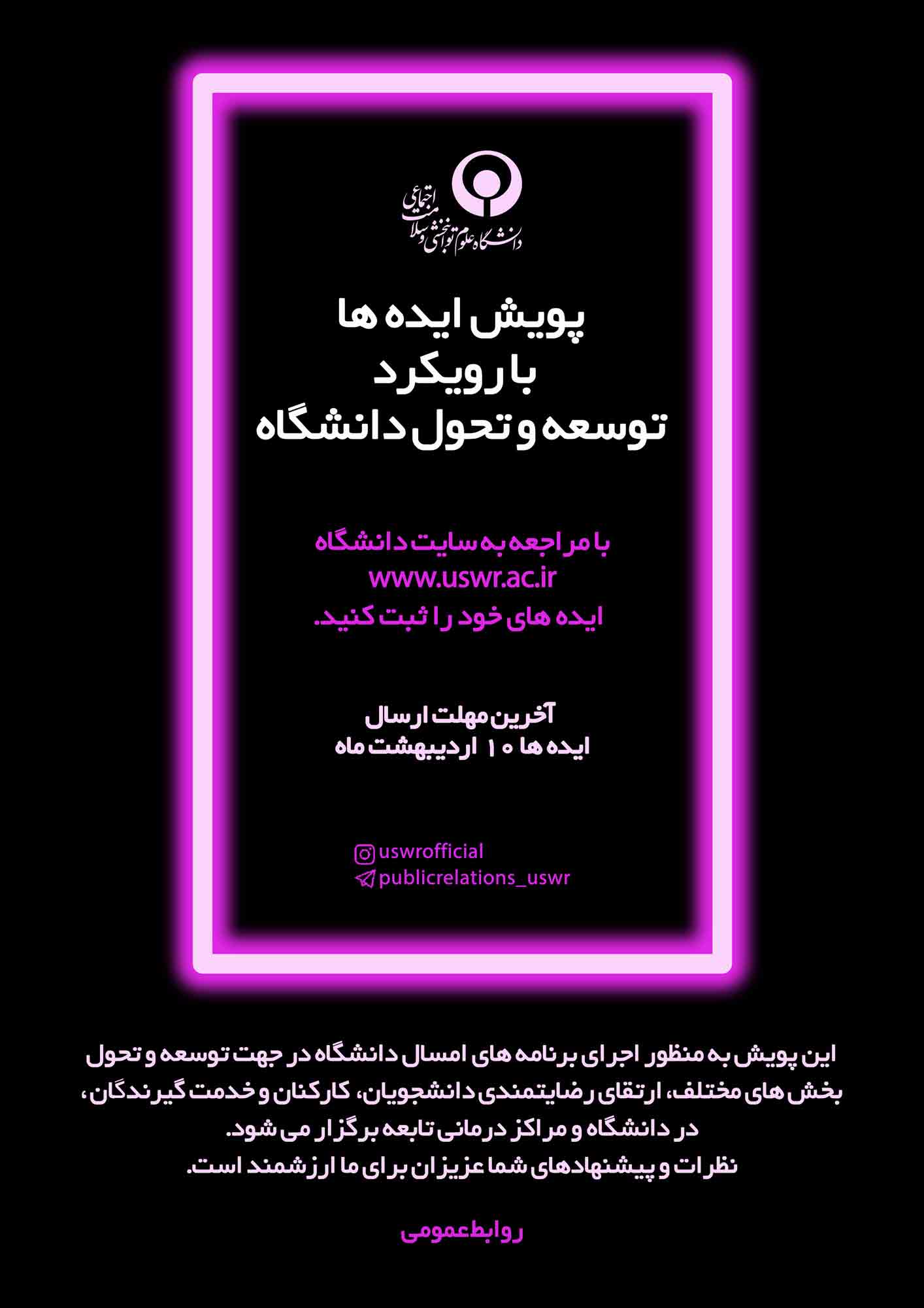 همه همکاران در هر سطح از رتبه کاری و فعالیت (اعضای هیات علمی، دانشجویان و کارکنان در بخش های مختلف) در دانشگاه و مراکز درمانی وابسته، می توانند برای شرکت در این پویش، ایده های واقع بینانه خود را که مطابق با شرایط حال حاضر و قوانین جاری کشور، و دارای قابلیت اجرا توسط هیات رئیسه دانشگاه باشد، از طریق صفحه اصلی وب سایت دانشگاه علوم توانبخشی و سلامت اجتماعی (در نوار بالای صفحه اصلی مشخص شده)، مطرح کنند.