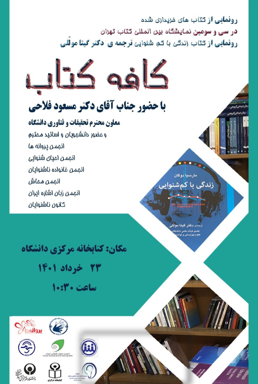 به گزارش وبدای دانشگاه، کافه کتاب دانشگاه علوم توانبخشی و سلامت اجتماعی، ساعت  10/30  روز دوشنبه 23 خردادماه جاری، با حضور دکتر فلاحی معاون پژوهشی دانشگاه، جمعی از اساتید و دانشجویان دانشگاه و همچنین نمایندگان چند انجمن و کانون حمایتی مرتبط با کم شنوایی مانند انجمن های پروانه ها، احیای شنوایی، خانواده ناشنوایان، محاش، زبان اشاره ایران و کانون ناشنوایان، در محل کتابخانه مرکزی دانشگاه برگزار می شود.