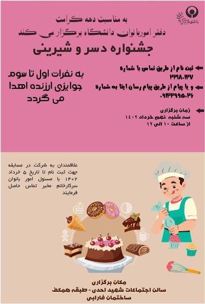اخبار > جشنواره دسر و شیرینی به مناسب دهه کرامت روز سه شنبه 9 خردادماه برگزار می شود