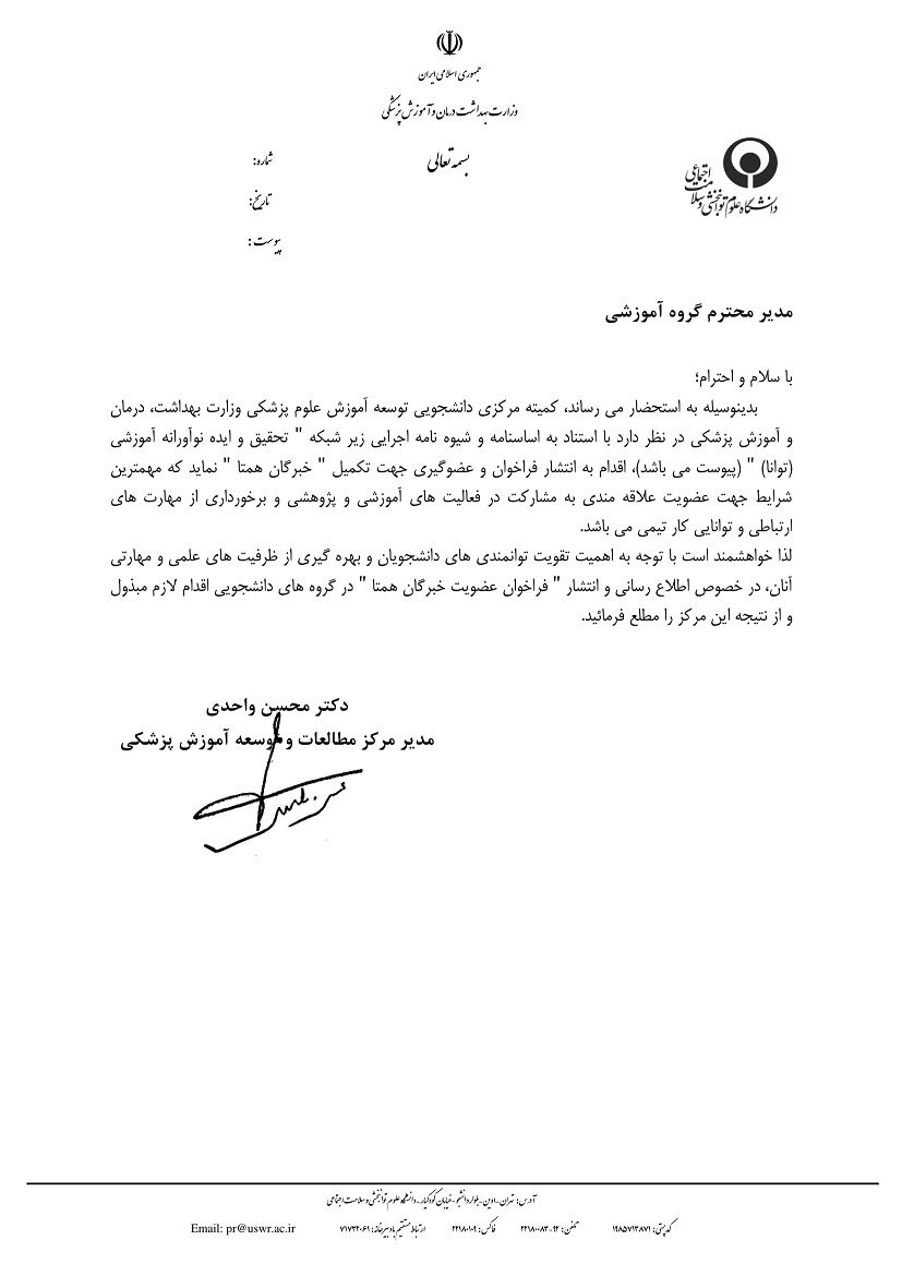 صفحه اصلی دانشگاهمعاونت آموزشیمعاونت پژوهشیمعاونت درمانمعاونت فرهنگی و دانشجوییکتابخانه مرکزیتماس با دانشگاه