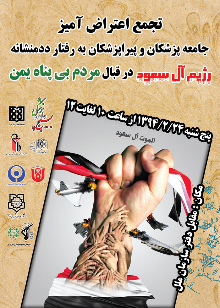 اخبار > تجمع اعتراض آمیز جامعه پزشکان و پیراپزشکان به رفتار ددمنشانه رژیم آل سعود در قبال مردم بی پناه یمن