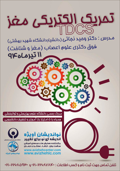 دوره تخصصی تحریک الکتریکی مغز (tDCS) از سری دوره های رویکردهای نوین علوم شناختی، با همکاری موسسه نواندیشان آویژه و دانشگاه علوم بهزیستی و توانبخشی و  تدریس استاد دکتر "وحید نجاتی" (فوق دکترای علوم اعصاب شناختی) در تاریخ 11 تیر ماه ۱۳۹۴ در دانشگاه علوم بهزیستی و توانبخشی- سالن شاملو برگزار می شود.