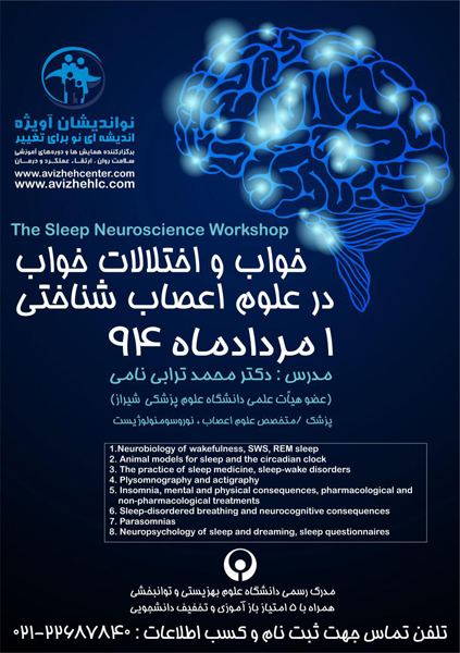 کارگاه تخصصی خواب و اختلالات خواب در علوم اعصاب، با همکاری موسسه نواندیشان آویژه و دانشگاه علوم بهزیستی و توانبخشی ، اول مردادماه در سالن شاملو دانشگاه علوم بهزیستی برگزار می شود.