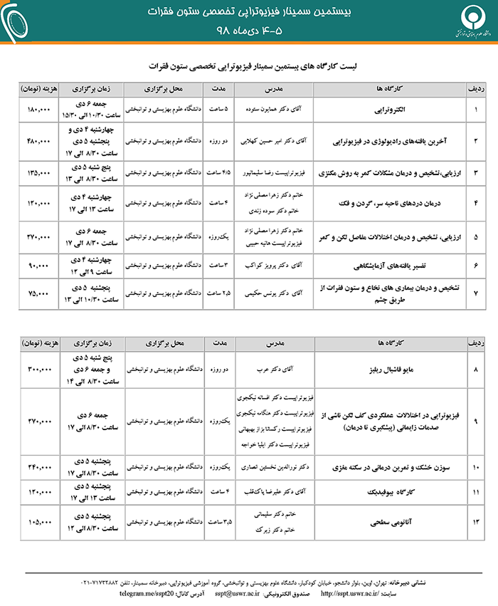 در آستانه برگزاری بیستمین سمينار فيزيوتراپى تخصصى ستون فقرات به اطلاع فارغ التحصیلان و دانشجویان رشته فیزیوتراپی می‌رساند برگزاری کارگاه‌های آموزشی و کاربردی متنوع زیر برنامه‌ریزی شده است. برای اطلاع از جزئیات کامل هر کارگاه شامل اسامی اساتید و مدرسین، سرفصل‌های آموزشی، تاریخ برگزاری، هزینه و نحوه پرداخت آن می‌توانید بر روی عنوان هر کارگاه کلیک فرمایید.